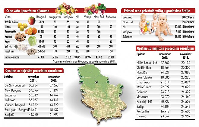 Piće u kafićima ili karte za gradski prevoz jesu dva do tri puta jeftiniji u unutrašnjosti nego u Beogradu, ali toliko su i zarade u glavnom gradu veće. Slične razlike vide se i kod penzija. U nerazvijenim opštinama one su u proseku oko 13.000, dok su u Beogradu prosečne penzije iznad 30.000 dinara. Odnos između najviše i najmanje razvijene jedinice lokalne samouprave, gledano prema nivou ekonomskog razvoja, iznosi 10:1. Čak 40 opština nalazi se na spisku devastiranih i one su uglavnom na jugu i istoku zemlje. Spisak ovih opština napravljen je prošle godine, ali Žarko Šunderić, menadžer vladinog tima za socijalno uključivanje i smanjenje siromaštva, kaže da se malo toga izmenilo i da su ovi regioni i dalje u najvećem problemu.