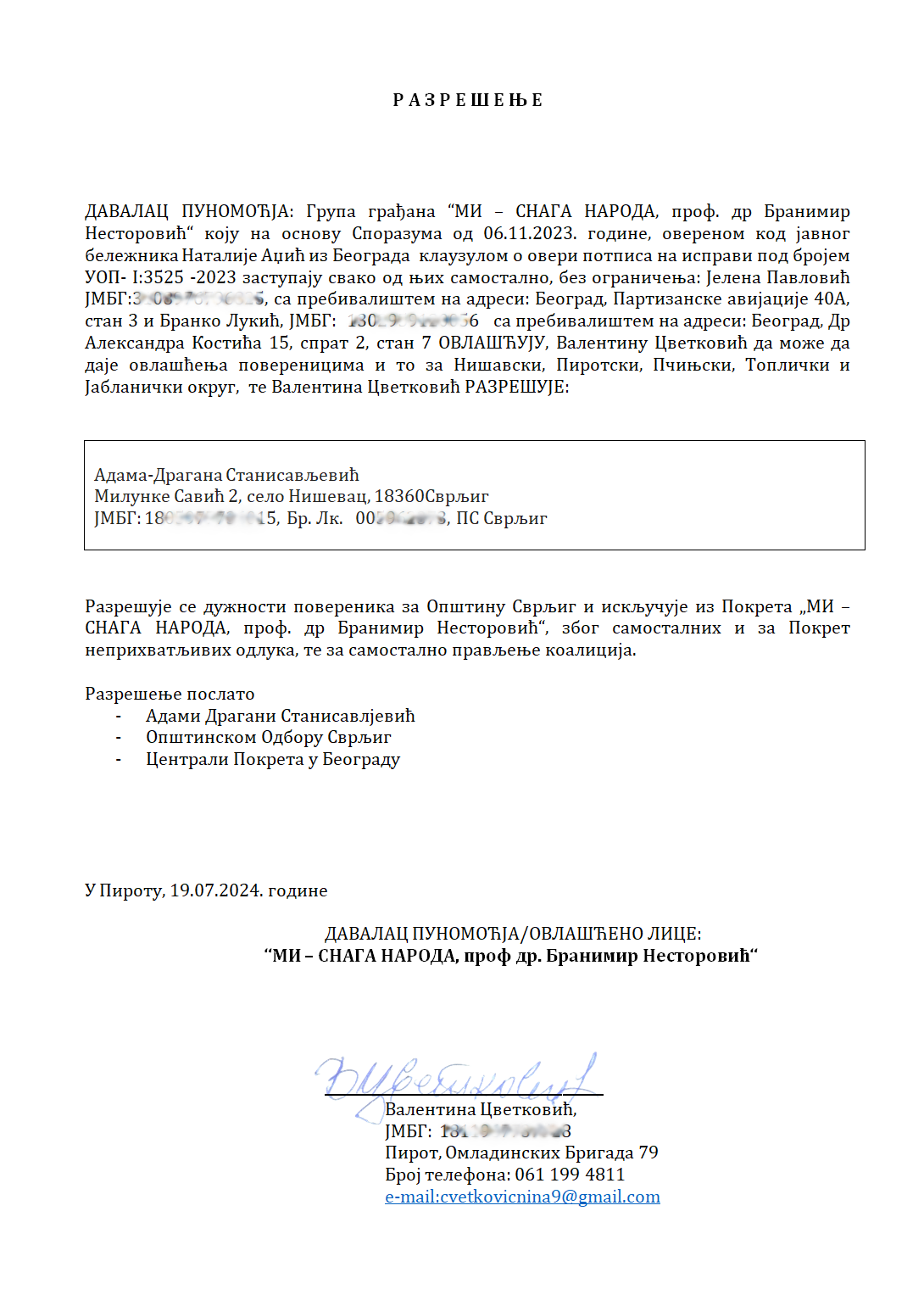 Pokret „MI SNAGA NARODA, prof. dr Branimir Nestorović“ odlukom koordinatora za Nišavski okrug od 19.07.2024. godine razrešio je Adamu Draganu Stanisavljević iz Niševca dužnosti poverenika za Svrljig i isključio istu iz Pokreta zbog njenog delovanja u Skupštini opštine Svrljig i sklapanja neprincipijelnih koalicija po svom nahođenju, mimo konsultacija sa Pokretom i protivno principima i stavovima kojima se Pokret rukovodi u svom radu, a isključivo zbog ličnih materijalnih interesa. Ovim se Pokret ograđuje od bilo kog delovanja navedene individue i njene akcije, stavove, odluke i istupanja u SO Svrljig i van nje ne priznaje i unapred se ograđuje od njih.